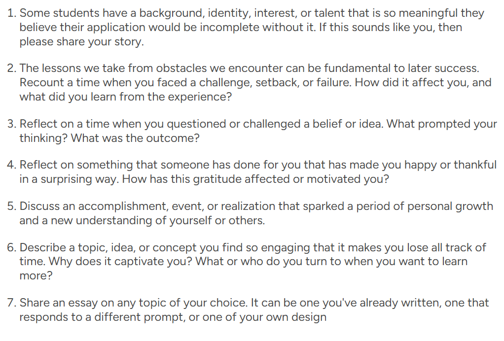 Northwestern gibi birkaç okul dışında ABD’deki tüm okullar CommonApp essayi zorunlu tutar. CommonApp essayini daha önceden belirlenmiş 6 konudan biri üzerine veya tamamen kendiniz uydurduğunuz bir konu üzerine yazabilirsiniz. 2025-2026 yılındaki 6 konu şunlardı: